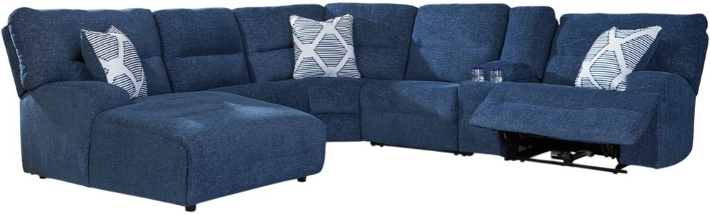 Includes left-arm facing power reclining back chaise, power armless recliner, armless chair, console with storage, wedge and right-arm facing power recliner