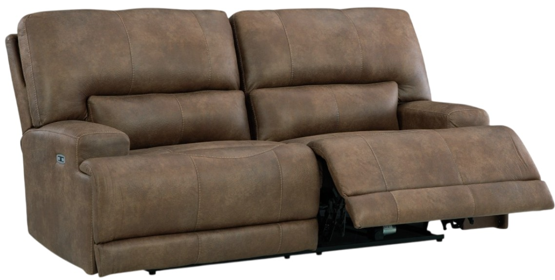 Expansive and elegant, this power reclining sofa makes a sizable style statement. Its large scale enhances the luxe look and magnifies the beauty of faux leather in an earth tone, punctuated with jumbo stitching. One-touch power adjustable headrests mean infinite ways to recline in stylish comfort. USB charging completes the experience.Read More