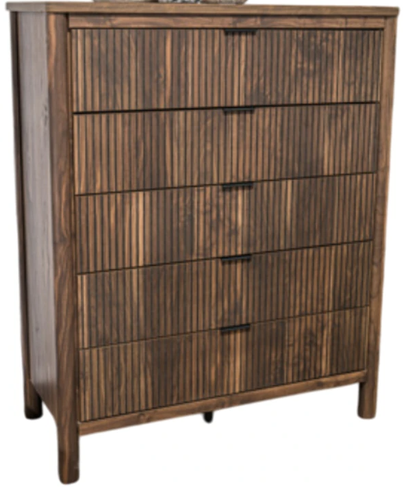 Crafted with both form and function in mind, this chest of drawers brings a dash of retro-cool character to your modern boho aesthetic. Reeded accents add an on-trend touch to its classic silhouette. Warmly welcoming with a rich brown finish, the piece pairs well with muted hues, earth tones and other neutrals alike.Read More