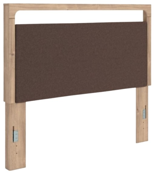 The natural wood tones and clean lines of this queen upholstered panel headboard echo your easygoing style sensibilities. With a warm finish and replicated oak grain, its carefree character lightens up your bedroom. Curved inner corner details soften the look, while contrasting brown fabric modernizes the feel.Read More