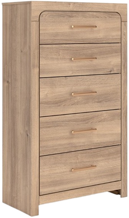 The natural wood tones and clean lines of this chest of drawers echo your easygoing style sensibilities. With a warm finish and replicated oak grain, its carefree character lightens up your bedroom. Curved inner corner details soften the look, while sleek bronze-tone hardware modernizes the feel.Read More
