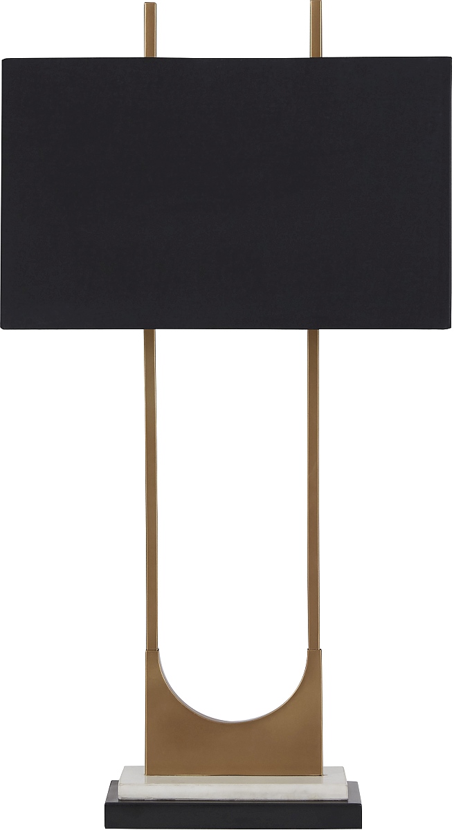 The open metal brass-tone frame adds elegant style to the look of this table lamp. It features a black rectangle shade, brass and black metal finish, white marble base and a 3-way switch. It is built with sheer perfection and adds a dazzling glow to your spaces.Read More