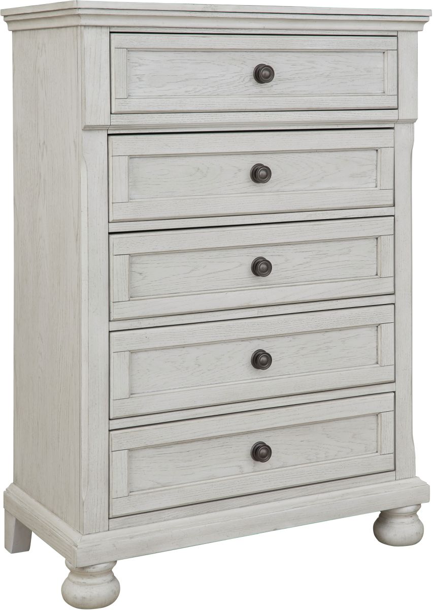Elegant, timeless furnishings take your bedroom to the next level. Nothing does that better than this chest of drawers. The antiqued white finish with a wonderful grain texture oozes sophistication, while dark bronze-tone knobs add an ornate touch. Felt bottoms in the upper drawers round out this tasteful piece.Read More