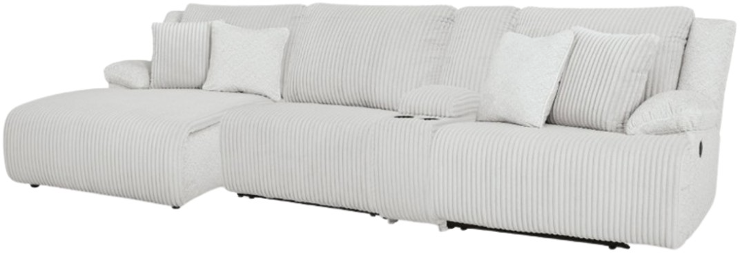 Includes 4 Pieces: Left-arm facing press back chaise, armless recliner, console with storage and right-arm facing recliner